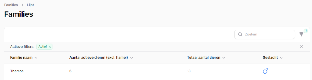 • Op detailoverzicht van mannelijke familie een kolom gecastreerd (ja/nee) toegevoegd (hier worden actieve hamels dus wél getoond)