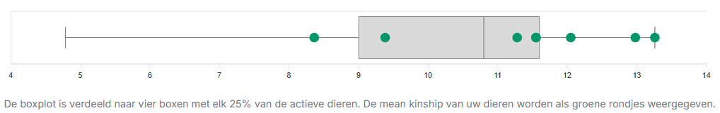 In ‘mijn stal’ wordt op de dieren overzichtspagina tevens alle dieren van de eigen stal getoond in een boxplot om in één overzicht de eigen dieren te kunnen vergelijken met de totale actieve populatie. Hiermee veranderen de getallen in informatie.